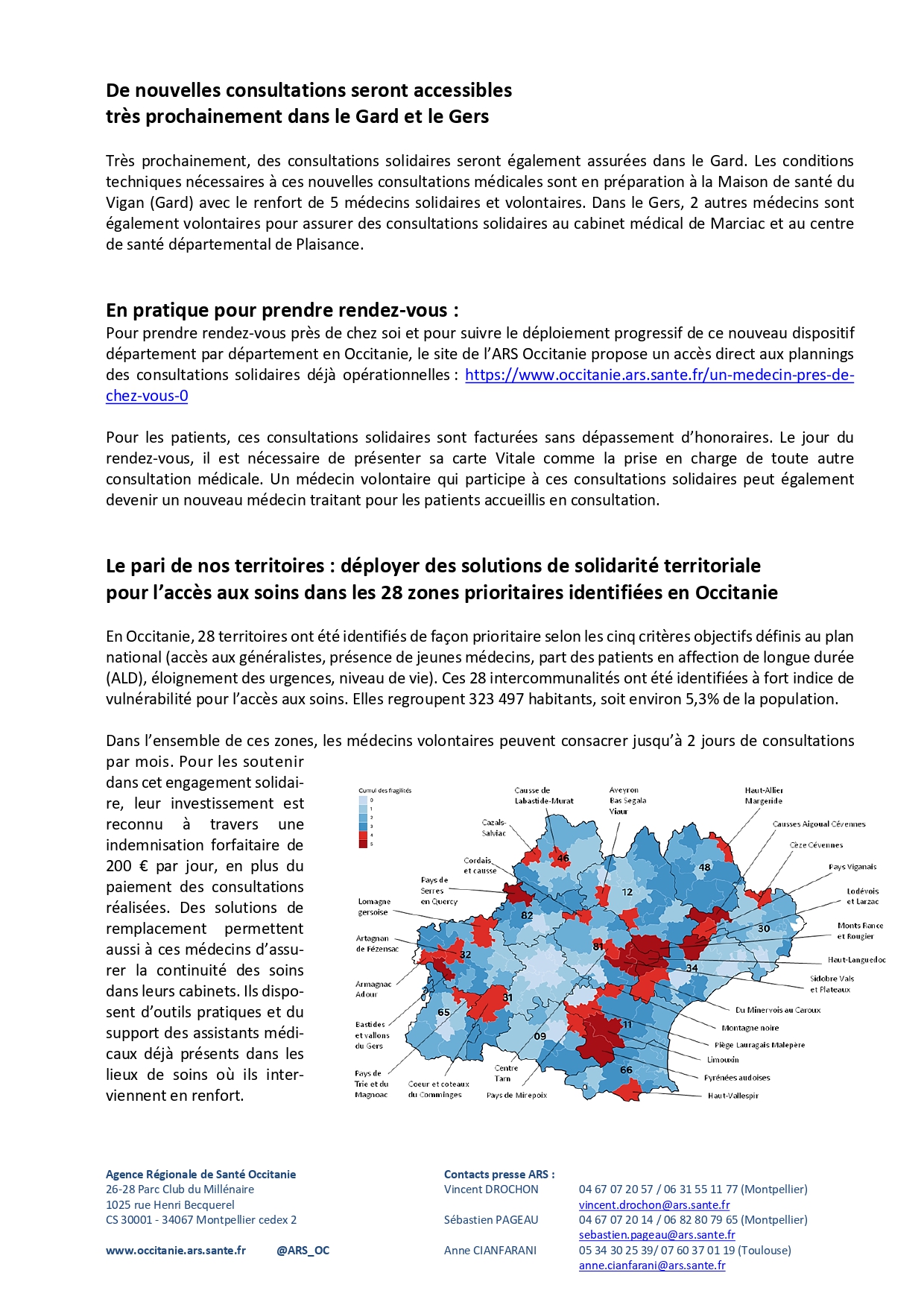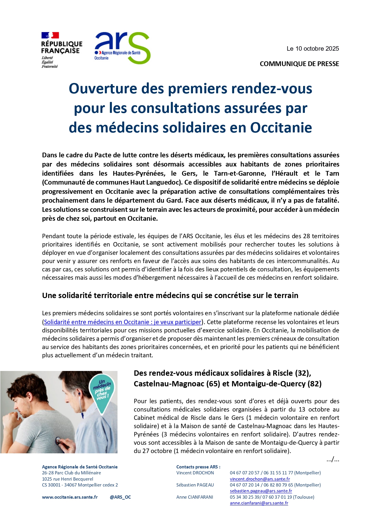 Communiqué de presse "Ouverture des premiers rendez-vous pour les consultations assurées par des médecins solidaires en Occitanie"