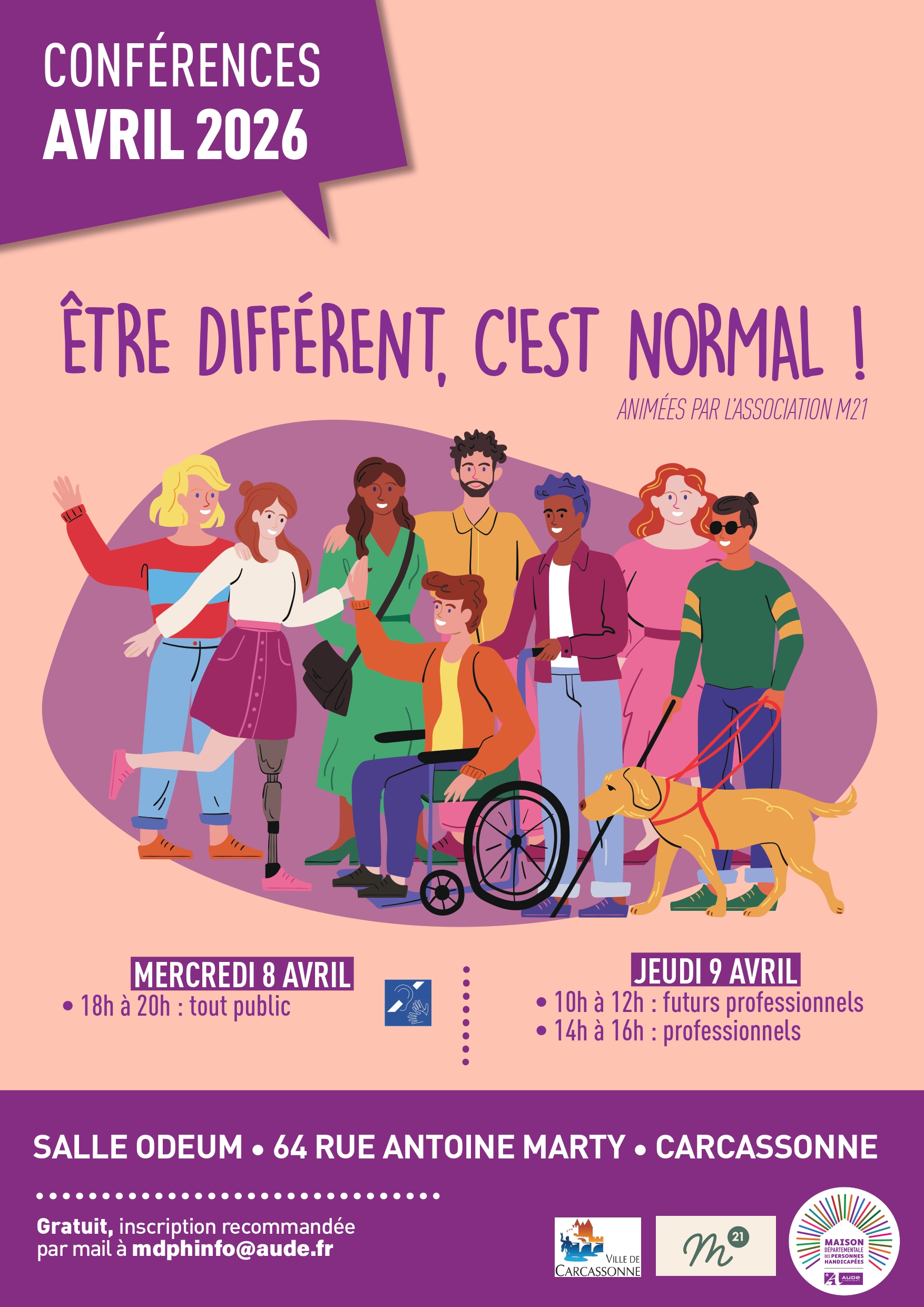 La MDPH de l'Aude et l’Association M21 ont le plaisir de vous inviter à la conférence interactive « Être différent, c’est normal », un temps fort de sensibilisation au handicap et à la différence.