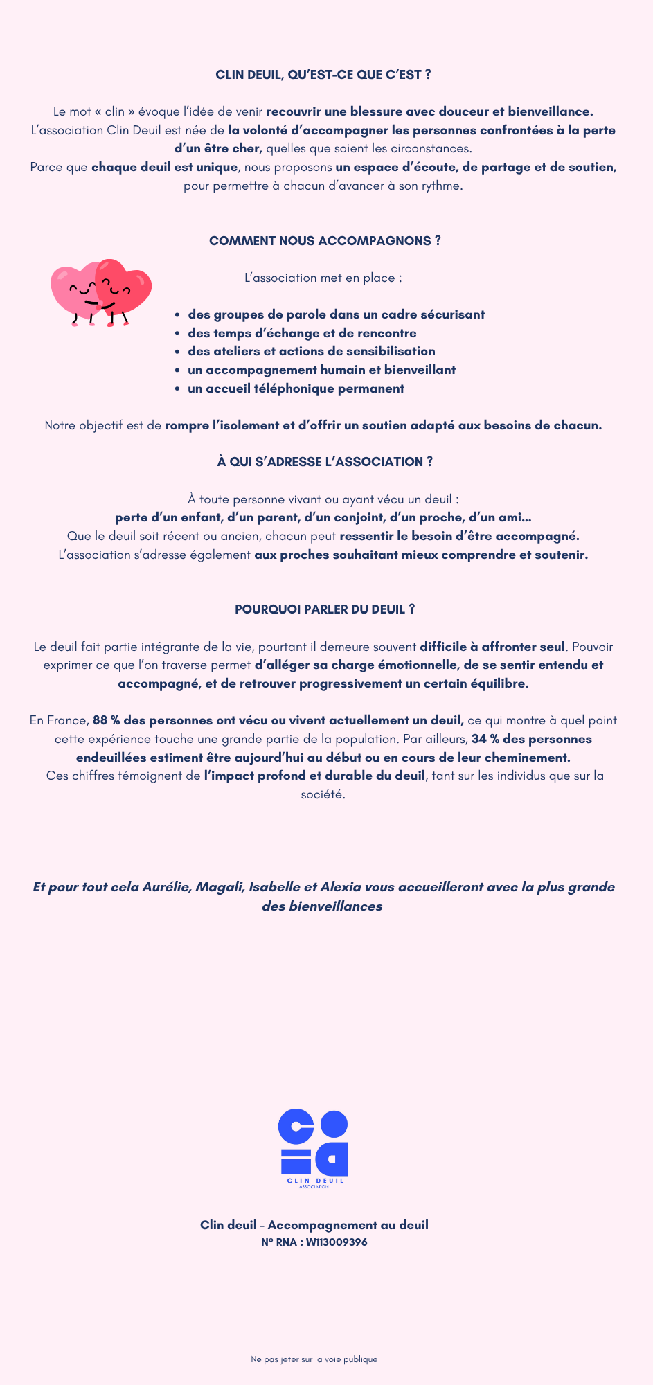 Le nom de l’association, Clin Deuil, évoque volontairement un « clin d’œil » : une invitation à porter un regard différent, plus doux et solidaire, sur cette étape de vie souvent difficile à traverser.