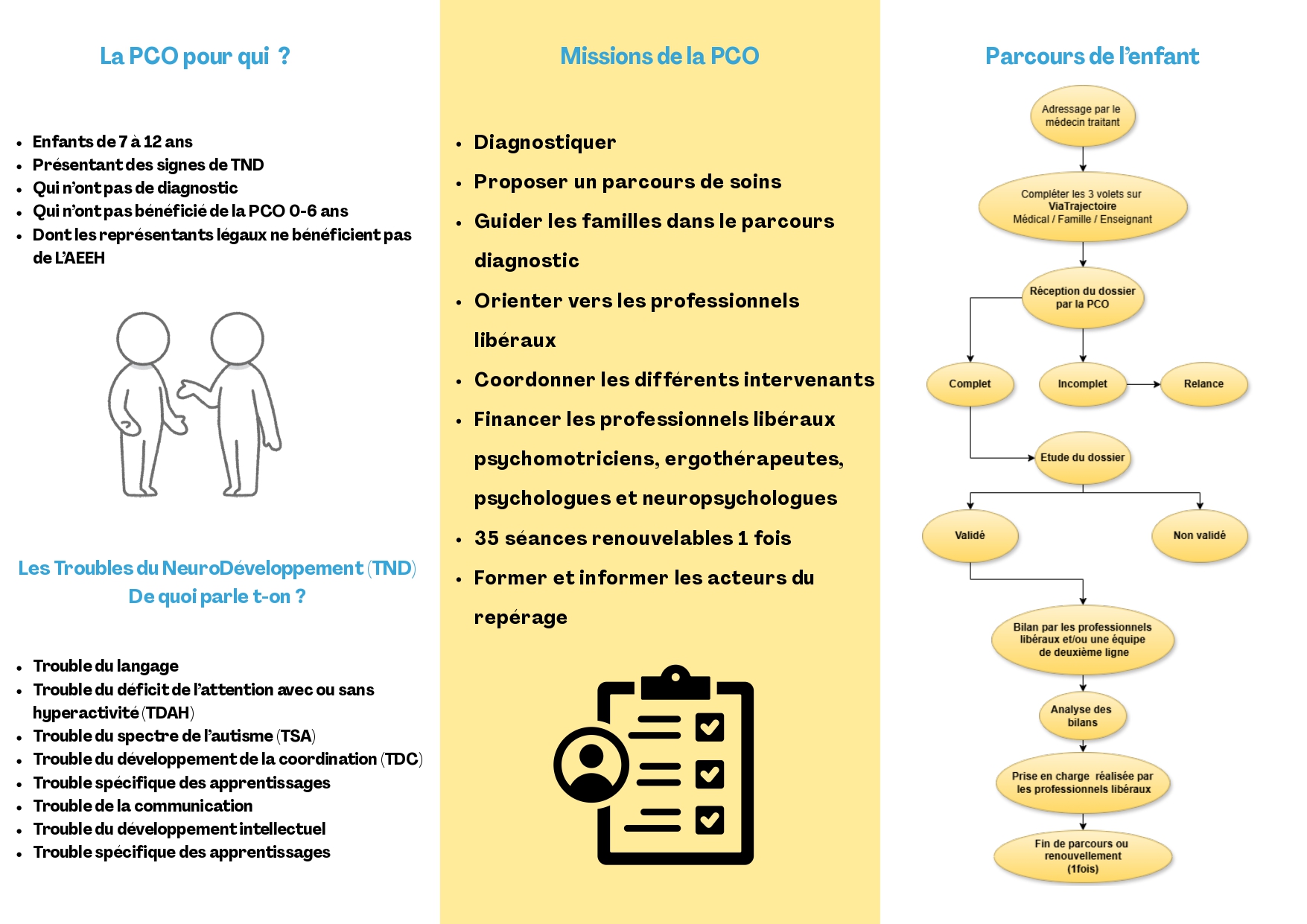 Dans le cadre de la stratégie nationale relative aux troubles du neurodéveloppement, la PCO 7–12 ans a pour objectifs de faciliter le repérage précoce, l’orientation et l’accès aux bilans. Elle assure notamment :