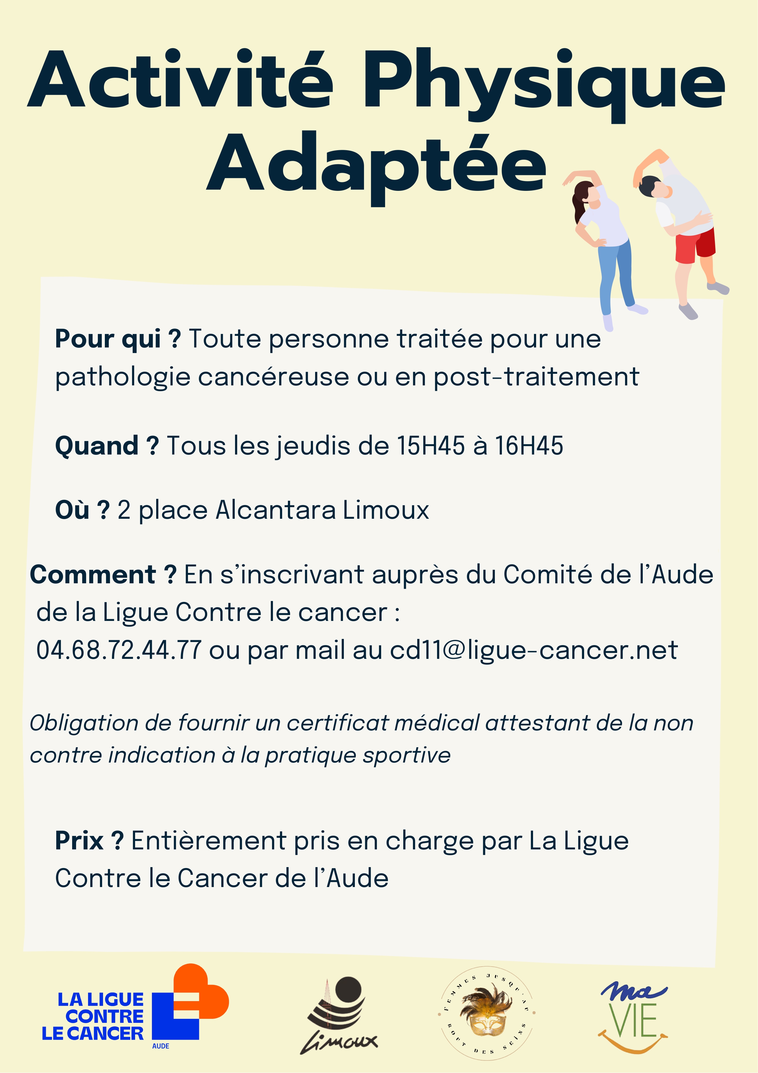 À partir de janvier, des séances d'Activité Physique Adaptée (APA), portées par La Ligue contre le cancer, la Mairie de Limoux et l'association "Femmes jusqu'au bout des seins", seront proposées dans la commune.