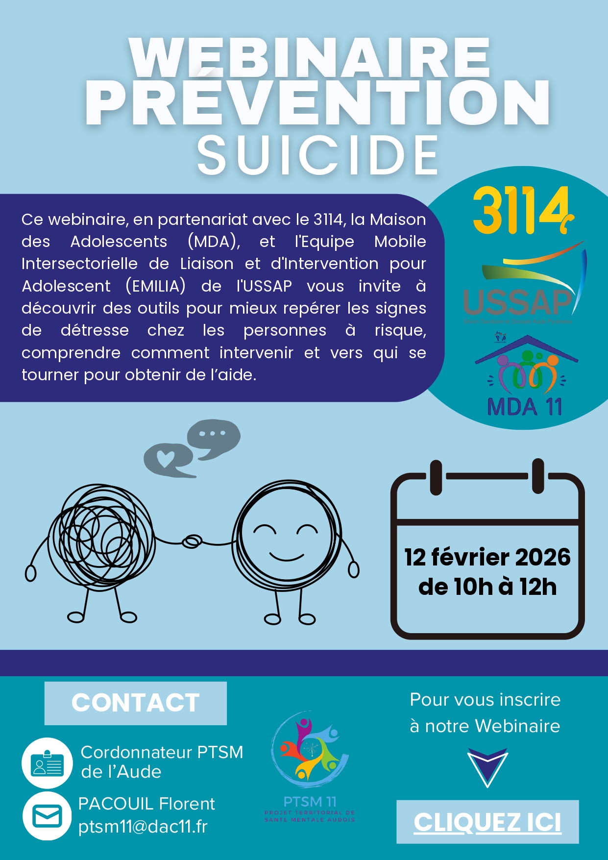Dans le cadre de ses actions de sensibilisation et de prévention en santé mentale, le PTSM de l’Aude organise un webinaire consacré à la prévention du suicide, le jeudi 12 février 2026, de 10h à 12h.